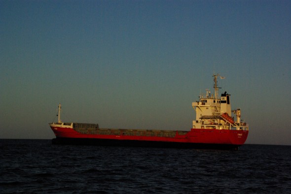 Det var inte många båtar vi mötte på vägen söderut. Desto trevligare var det då vi i södra Kalmarsund blev uppropade av finskägda lastfartyget Tingö som låg för ankar och väntade på besked om följande frakt. Vakthavande ville komplimentera oss för vår vackra och gedigna långfärdsbåt och samtidigt få prata bort en stund på finska. ”Vi fick fina bilder av er här uppifrån bryggan med solnedgången i bakgrunden.”