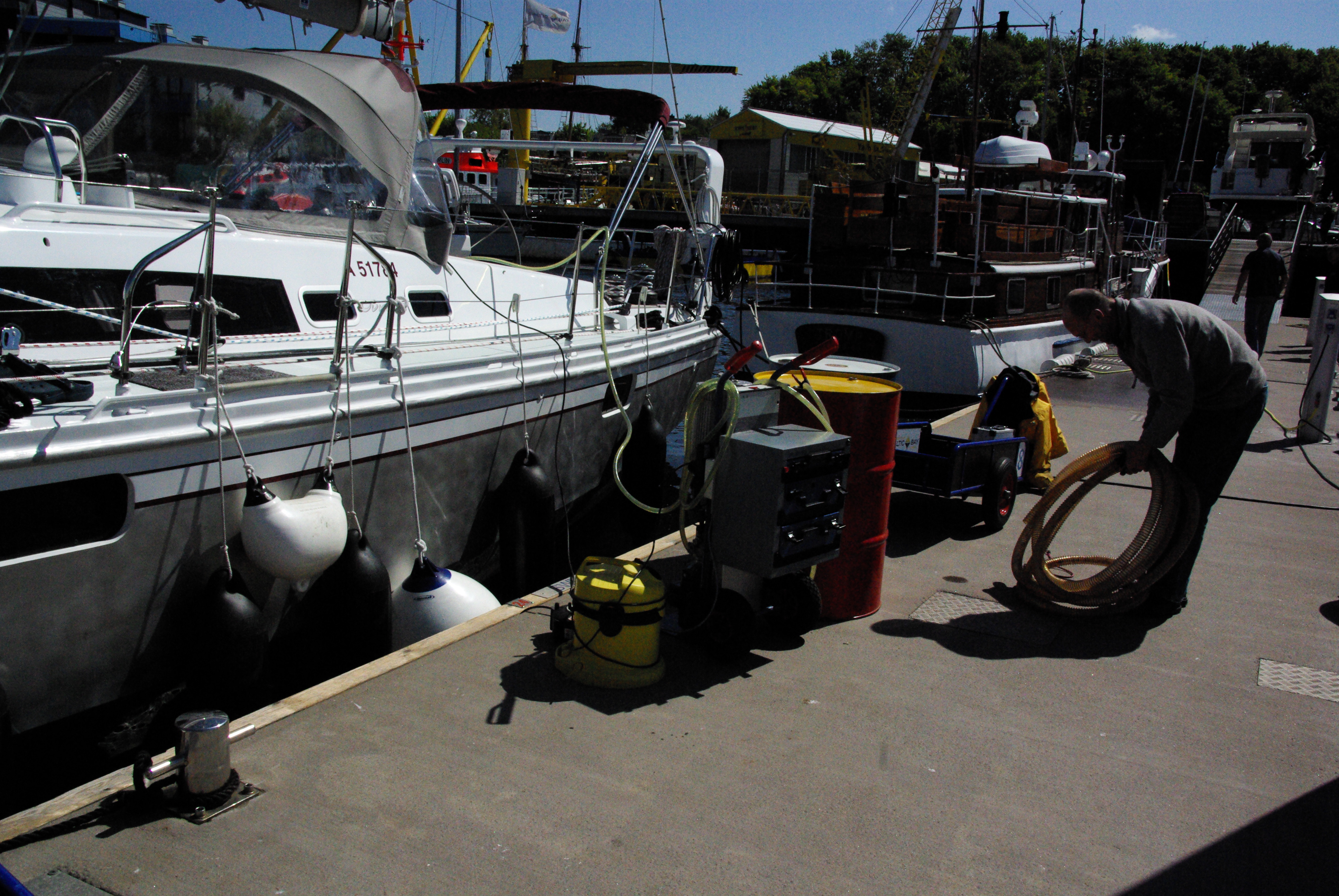 Eftersom vinden låg illa på i Olympiahafen gick vi i stället till Laboe på östra sidan av inloppet till Kiel. Detta visade sig vara lyckat eftersom ingen av de sju kommunala gästhamnarna i Kiel tillåter dieselsanering. Men i Laboe lever gästhamn och reparationsvarv sida vid sida med samma ägare, så där var det inga problem. Dessutom är gästhamnen i Laboe förstklassig på alla vis, med fina stora bryggor, butiker för båttillbehör och en duglig restaurang med fin utsikt över Kielbukten.