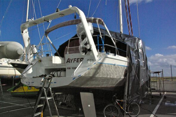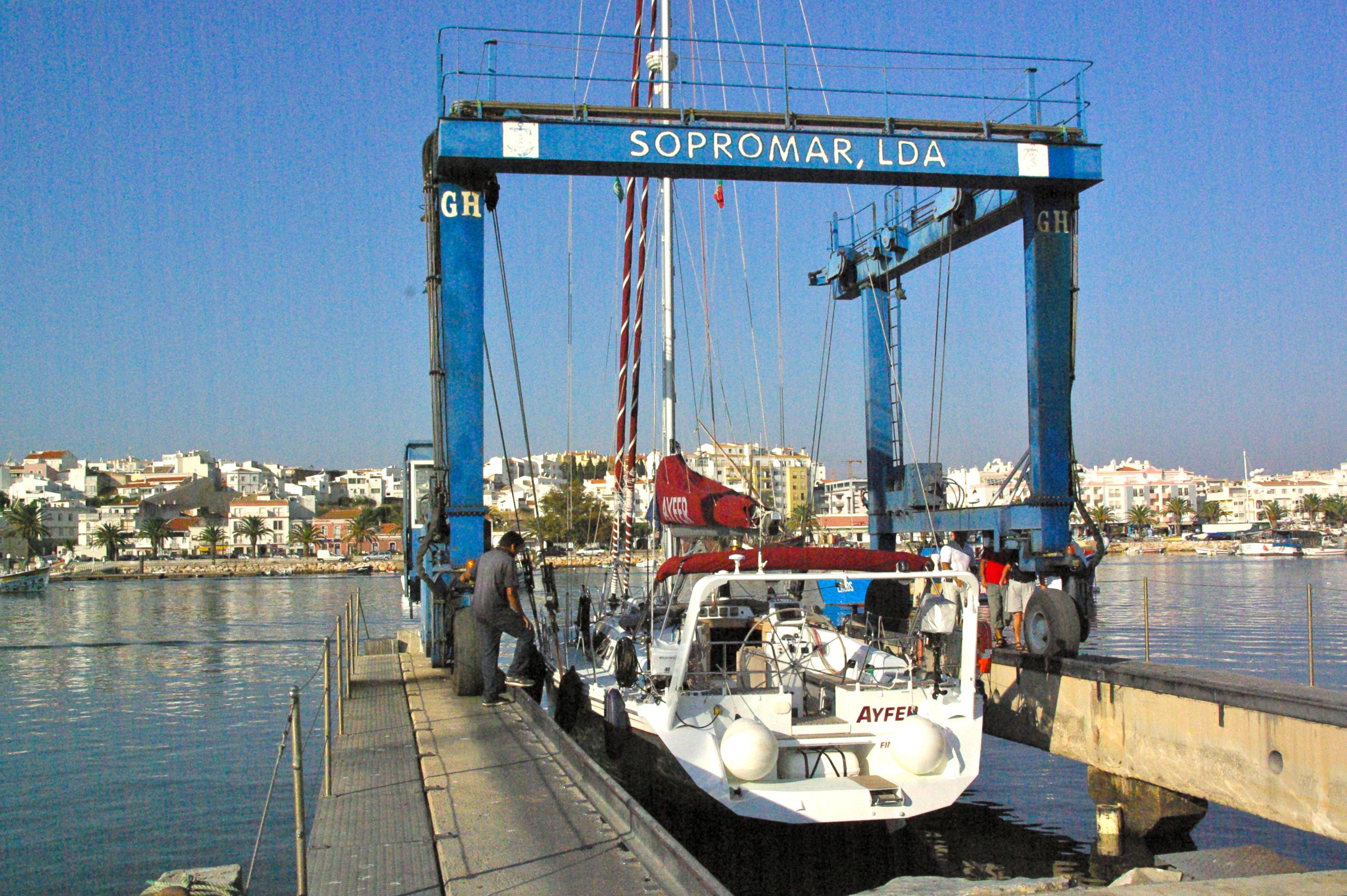 Innan vi flög hem till Finland i början av oktober var det dags att ta upp Ayfer på Sopromarvarvet, som ligger granne med Marina de Lagos, för att göra om garantireparationerna från i somras.