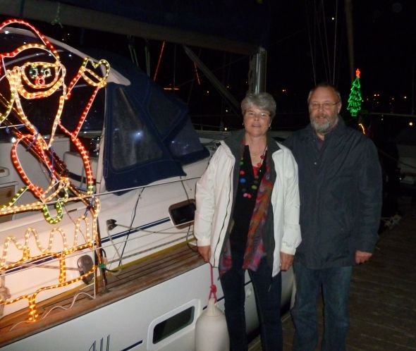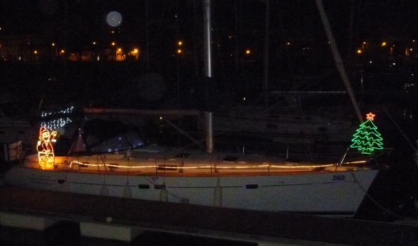 Marina de Lagos har utlyst en tävling om bästa juldekoration ombord på båtarna i marinan. Själva deltar vi inte i tävlingen eftersom s/y Ayfer står på land på Sopromarvarvet. Men vår favorit är avgjort denna Oceanis med såväl julgran som tomte – enkelt och stilrent. Att båten dessutom råkar heta Celebration gör ju inte saken sämre.