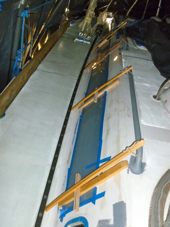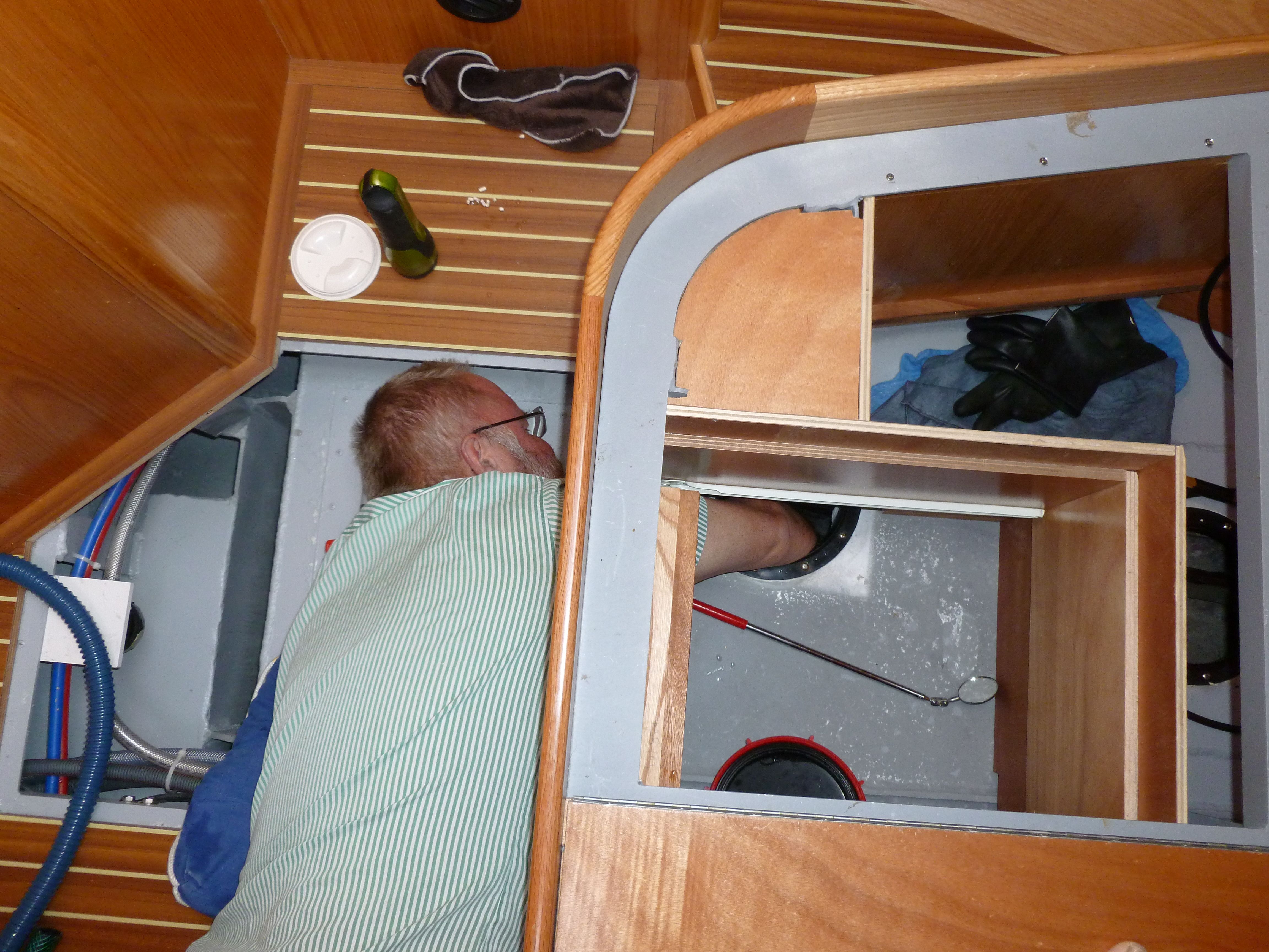 Långsegling är inte bara avkoppling, goda måltider och trevliga kringaktiviteter, utan också en massa underhållsarbete. Listan över ogjorda arbeten är oftast lång eller mycket lång. För att visa att vi inte ligger på latsidan är det på sin plats med en bild från tvätten av babords vattentank härom dagen. Tvätten utfördes med hjälp av lånad trycktvätt med hetvattenfunktion, grön scotch brite (”björntunga” på finlandssvenska) och alla upptänkliga verktyg och köksredskap som kan förlänga armarna. Spegel och ficklampa är oumbärliga i detta arbete. Trots att arbetet till 90 % utfördes av Nina var det endast Svante som fastnade på bild. Livet är tyvärr inte rättvist!