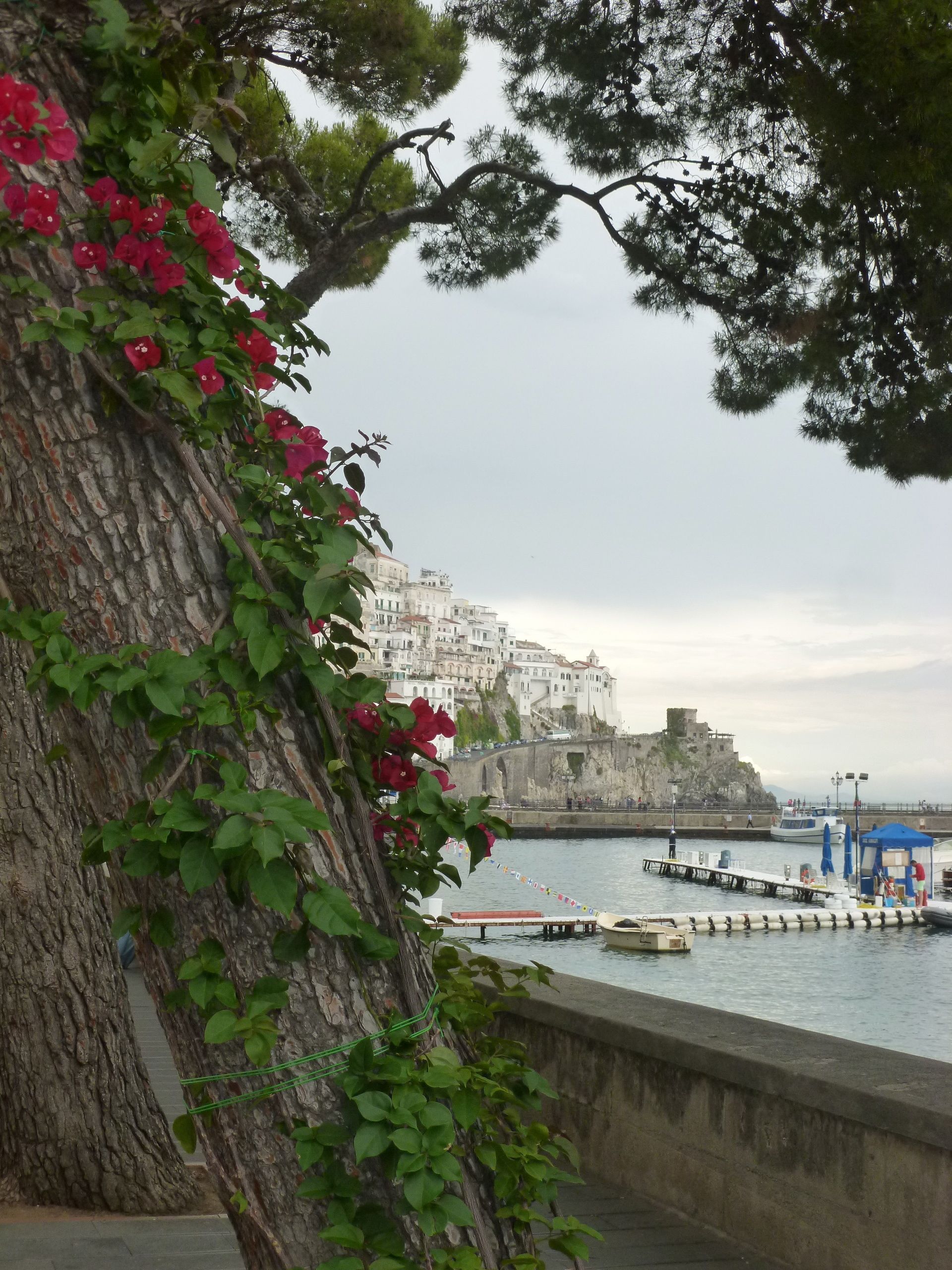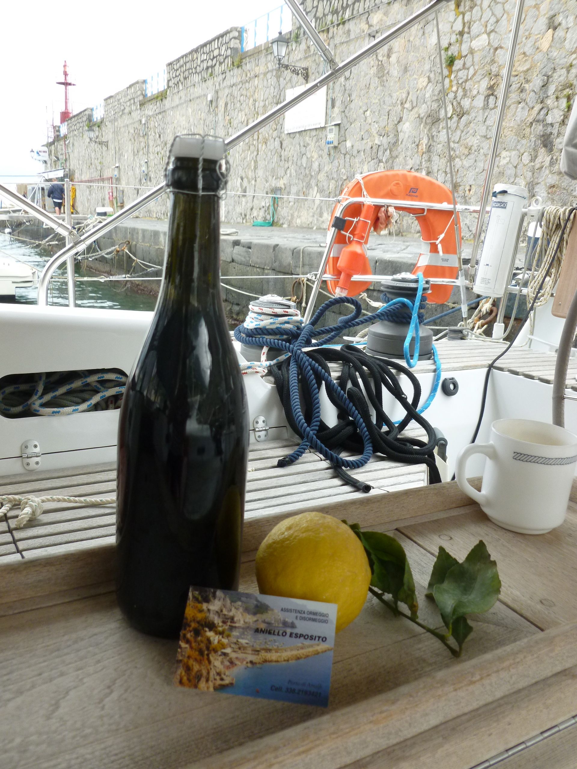 På väg till Amalfi passerade vi Capri, som vi vid det här laget insett att man bäst besöker utan medhavd segelbåt (så Capri och villa San Michele, vi kommer igen!). I den lilla hamnen i Amalfi var det full svinga efter det gångna dygnets sydliga vind. Vi fick dock god hjälp med att förtöja mot den höga kajen på insidan av vågbrytaren och som välkomstgåva av den vänliga personalen en flaska rött bubbel och en nyplockad citron. Kajen var så hög och båtens rörelser så intensiva att det inte var helt behagligt att ta sig till och från båten över landgången. Något mildrades ryckningarna i skrovet av de kraftiga fjäderdämpare hamnen ställde till förfogande.