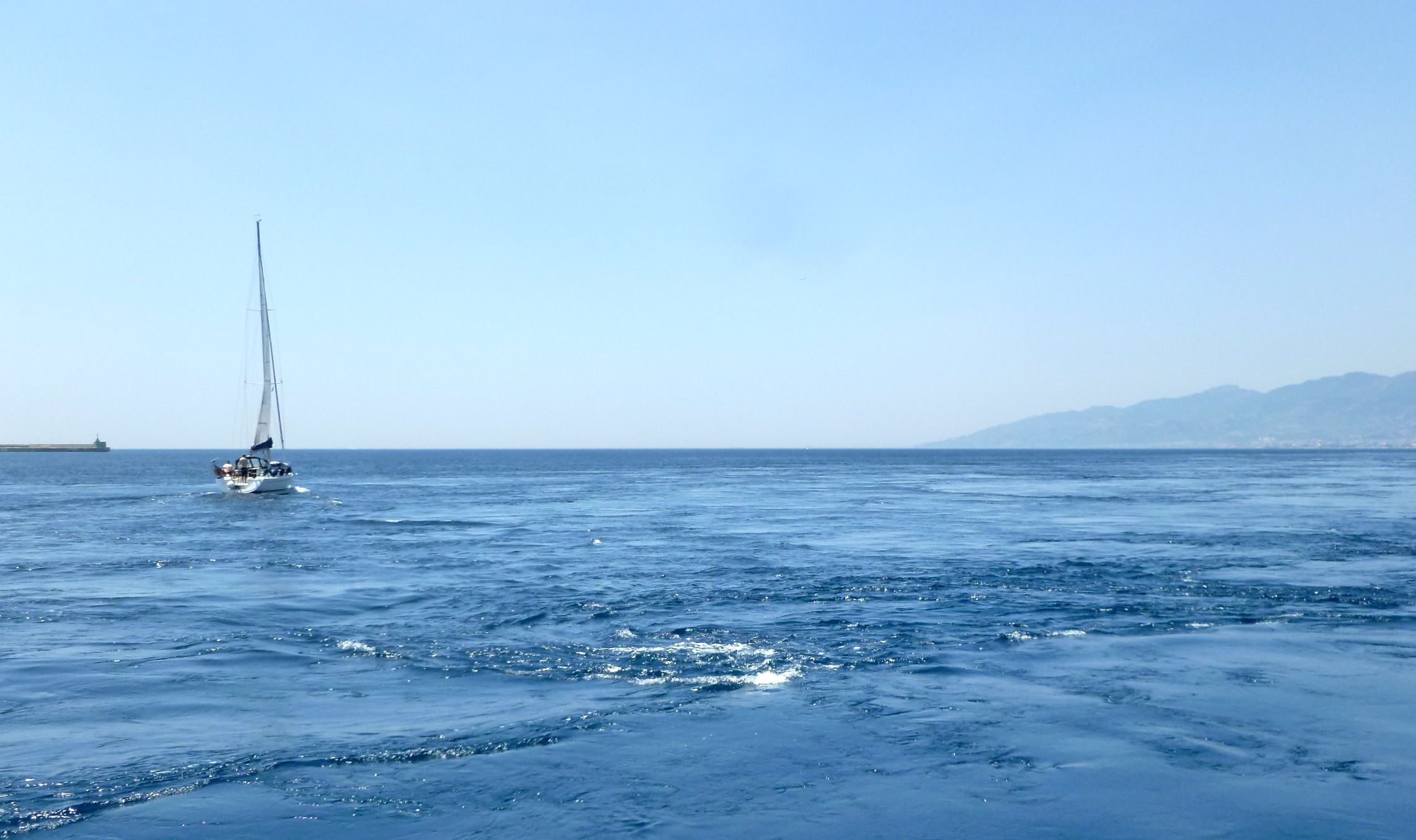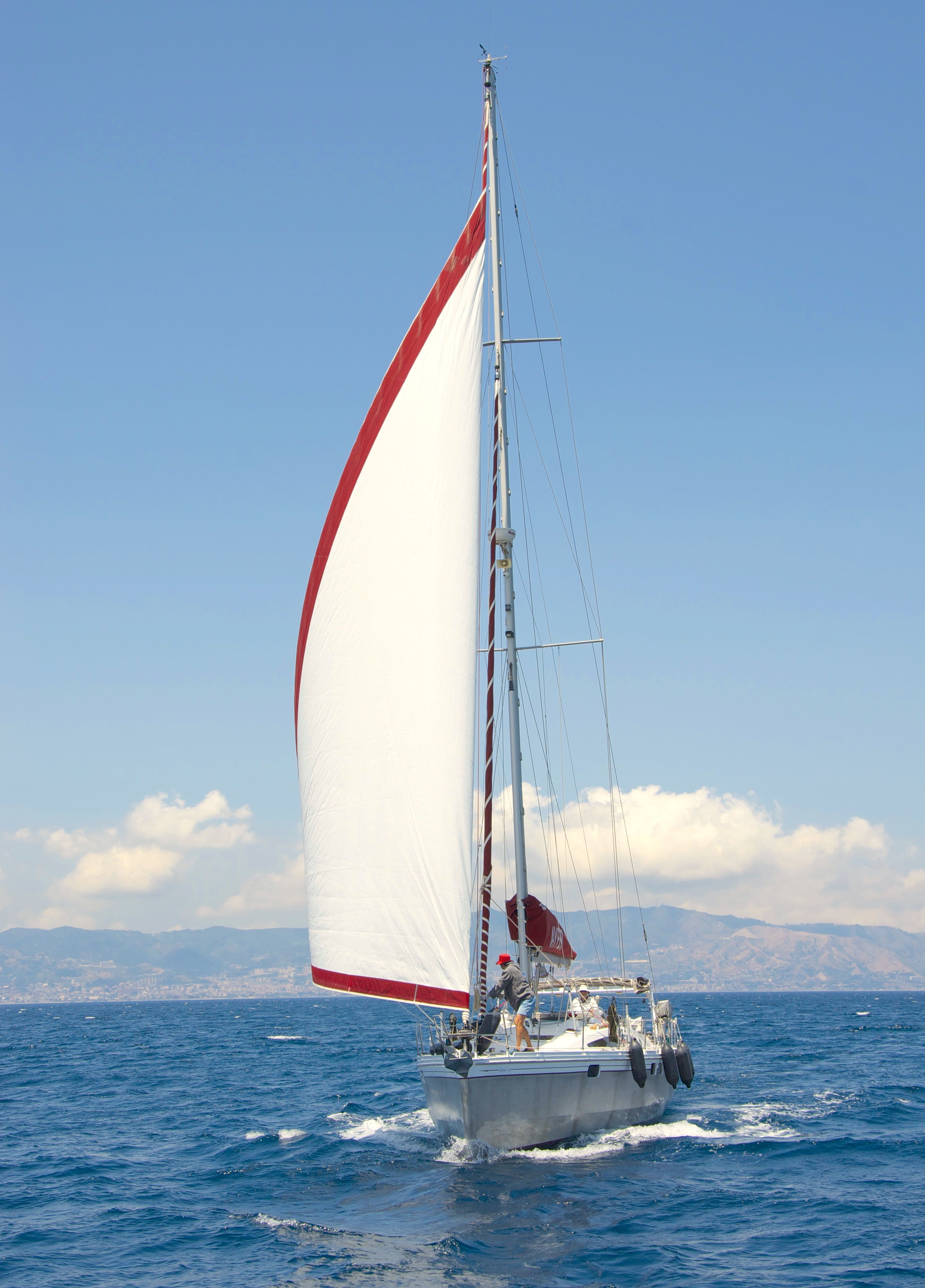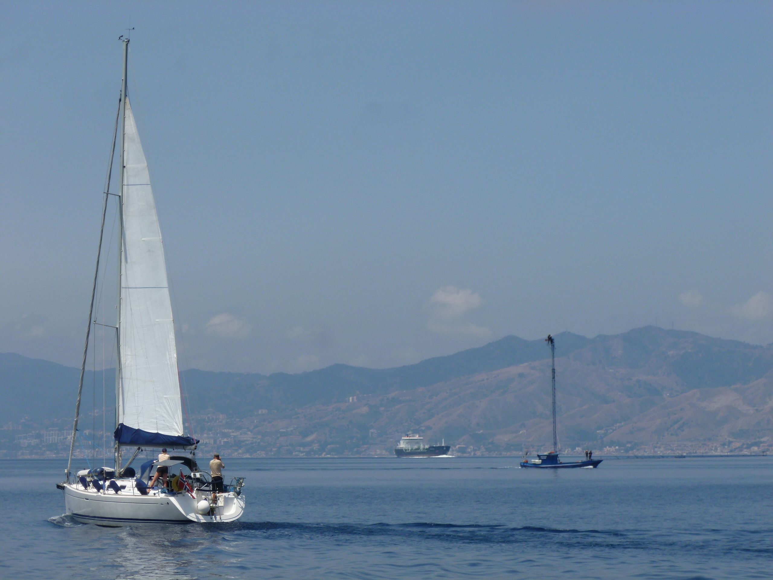 Från Tropea är det en kort dagsetapp till Messinasundet. Vi kastade tidigt loss för att hinna genom sundet i god tid, då det hade utlovats kraftigare vind till eftermiddagen. Först blåste vinden från diametralt motsatt håll än det var utlovat, men på väg mot sundet korrigerade vinden sig och lade sig på nordväst. Då vi gled in i sundet fick vi sällskap av några av de svärdfiskebåtar som håller till i Messinasundet.