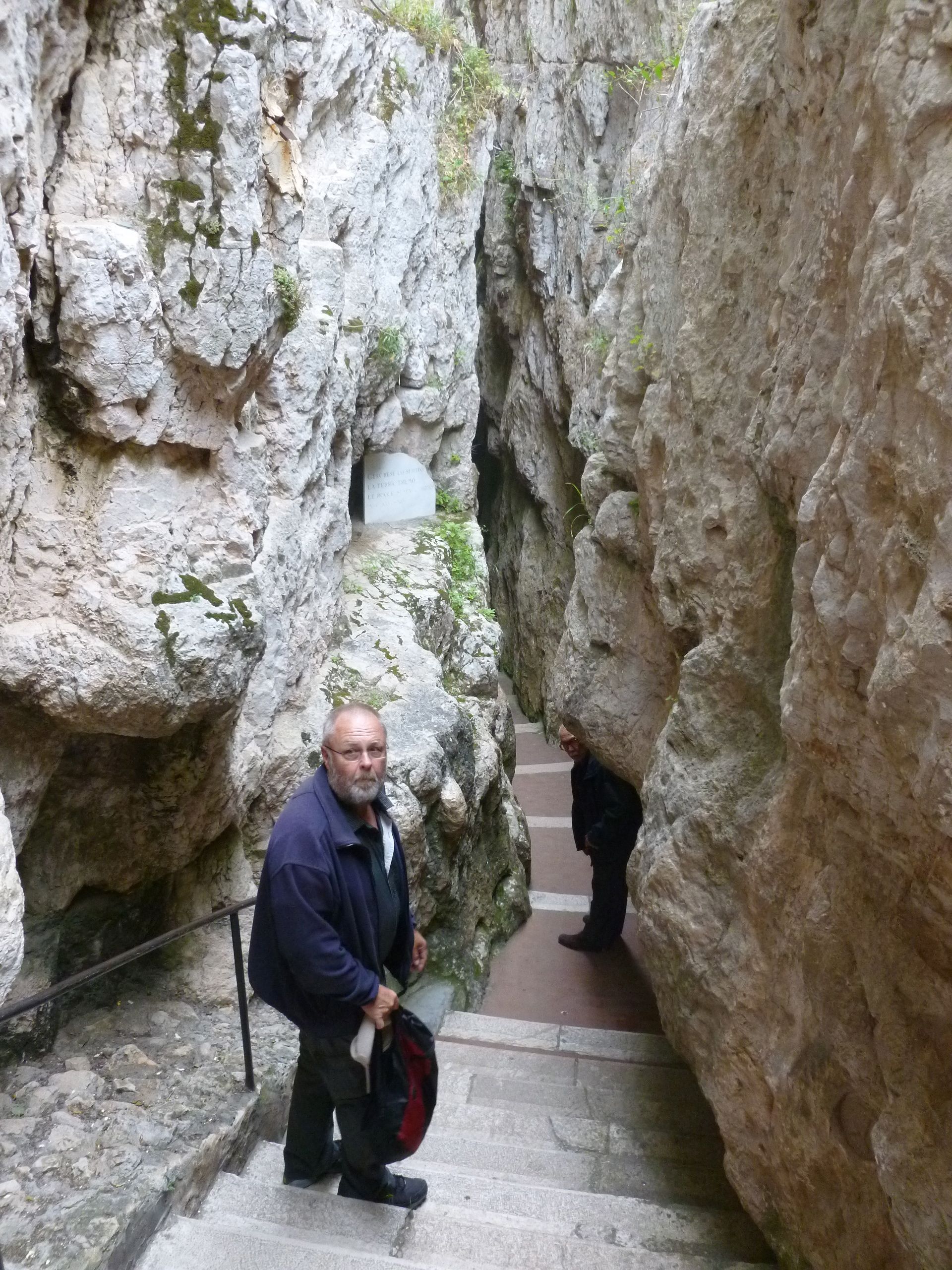 Svante på väg ned för trappan till Det heliga korsets kapell i en av tre spektakulära bergssprickor i Gaeta