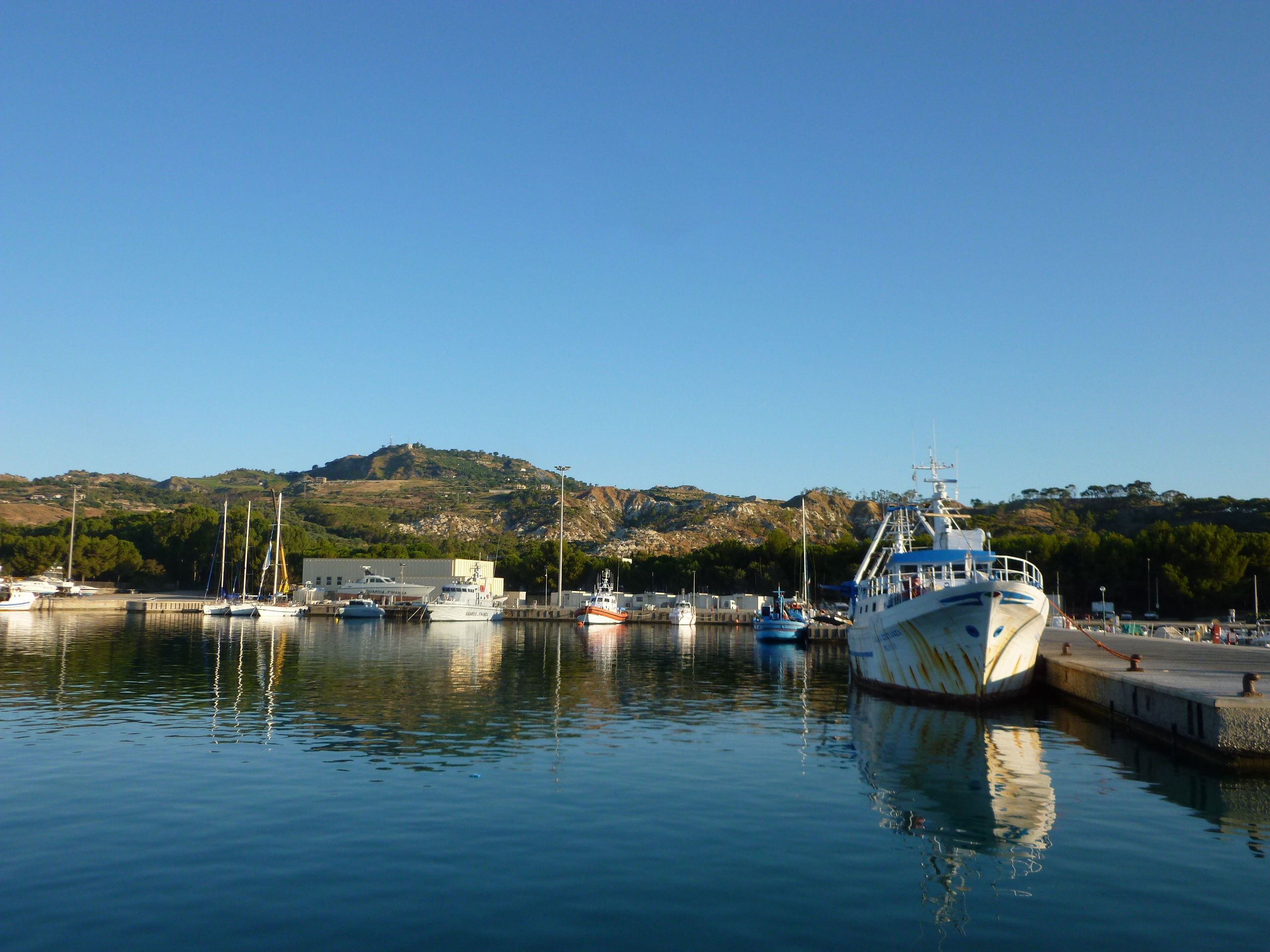 Det var tre nöjda besättningar som i strålande sol på seneftermiddagen förtöjde i marinan i Roccella Ionica efter en lång dagsetapp. Enligt Rod Heikells utmärkta guide över de italienska vattnen och hamnarna, får man vara försiktig då man närmar sig denna hamn eftersom hamninloppet är utsatt för s.k. silting. Det vill säga att det byggs upp en sandbank i hamninloppet, som blir allt grundare och grundare, ända tills man muddrar upp det igen. Men vi hade oroat oss i onödan, marinan hade fått nya ägare, inloppet var nymuddrat och bryggorna med fingerpontoner i toppskick.