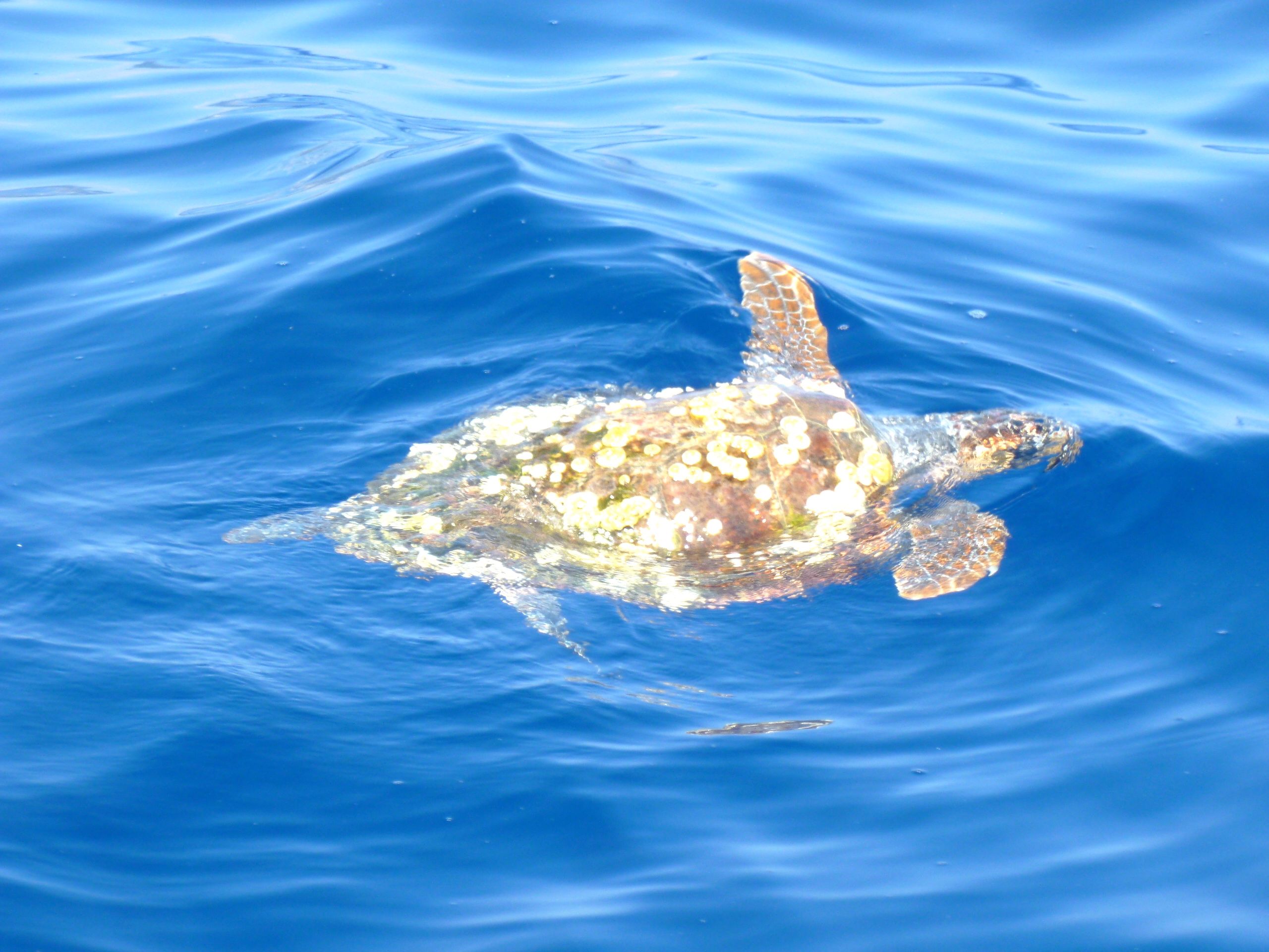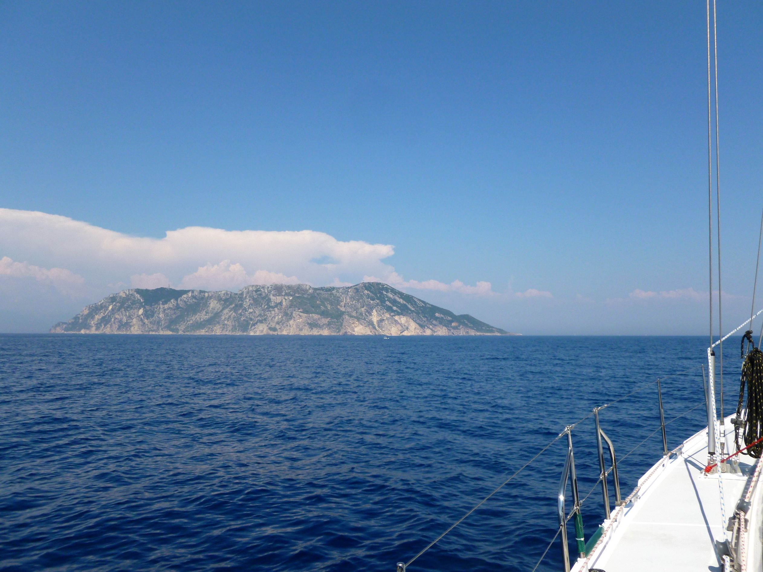 På väg från Santa Maria di Leuca till ön Nisos Othoni nordväst om Korfu fick vi hyfsad segling en stor del av vägen. Vi fick också påhälsning av delfiner denna gång. Det är någonting man aldrig tröttnar på, utan det är lika roligt varje gång dessa lekfulla livsbejakande djur simmar runt båten. Vi rullade in genuan och beslog storseglet i god före Nisos Othoni. Heikell varnar för de s.k. katabatiska vindar som blåser nedför sluttningarna på högre öar. Eftersom det är bekvämare för en lat skeppare att packa in ett storsegel i svag vind än med fallvindarna vinande runt öronen, hörsammade vi Heikells råd. Och på köpet fick vi se en simmande sköldpadda där vi sakta gled fram under våra manövrer med seglen.