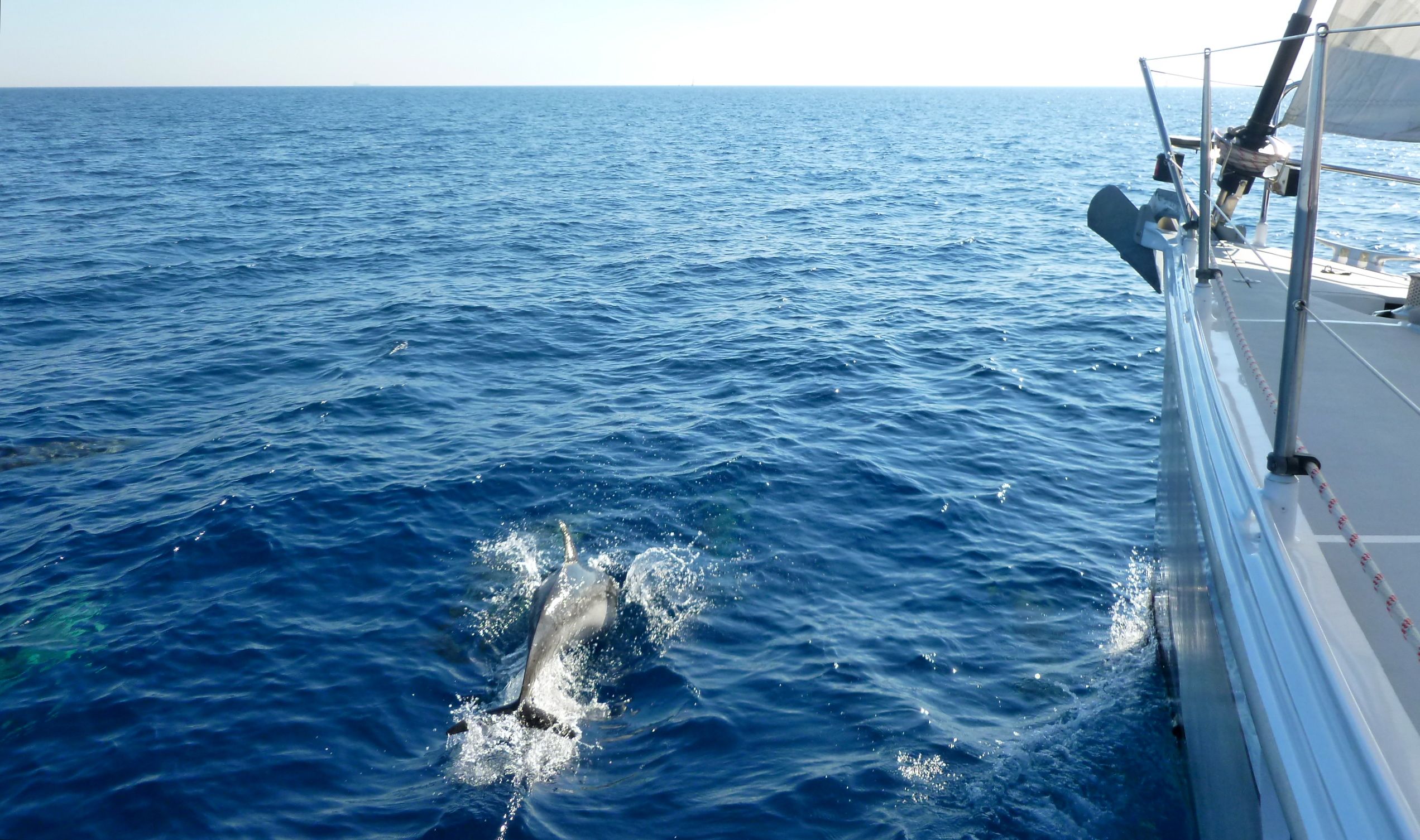 Vi hade också haft förträfflig underhållning på vägen då ett större gäng med delfiner slog följe med våra båtar. Detta var någonting som upprepades med jämna mellanrum på vår väg mot Korfu. Trevligt nog hade Per på Midi videokameran till hands och kunde sedan dela med sig av videon med delfinerna hoppande framför bogen på Ayfer. På Tyrrenska havet såg vi inte en enda delfin, men efter att vi passerat Messinasundet och kommit ut på Joniska havet, fick vi gång efter gång besök av stora delfinflockar. Efter ett uppfriskande bad på beachen invid marinan i Roccella Ionica, var det med god aptit vi högg in på pizzan som serverades som metervara på den trevliga pizzerian i hamnen.