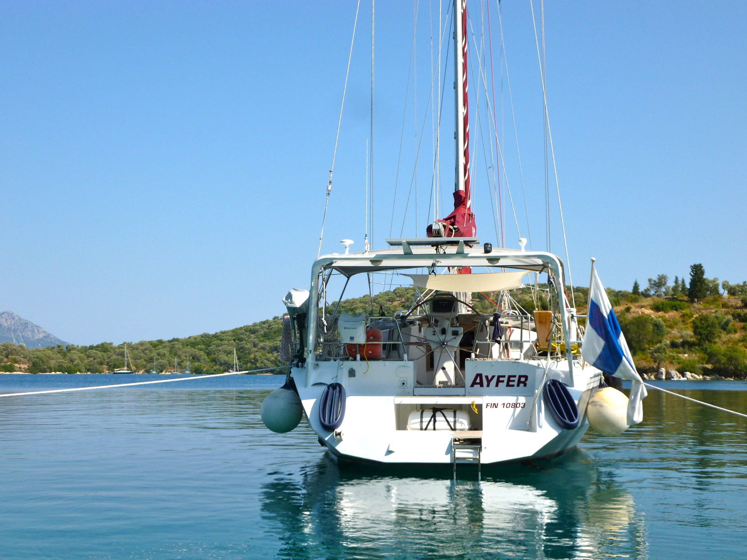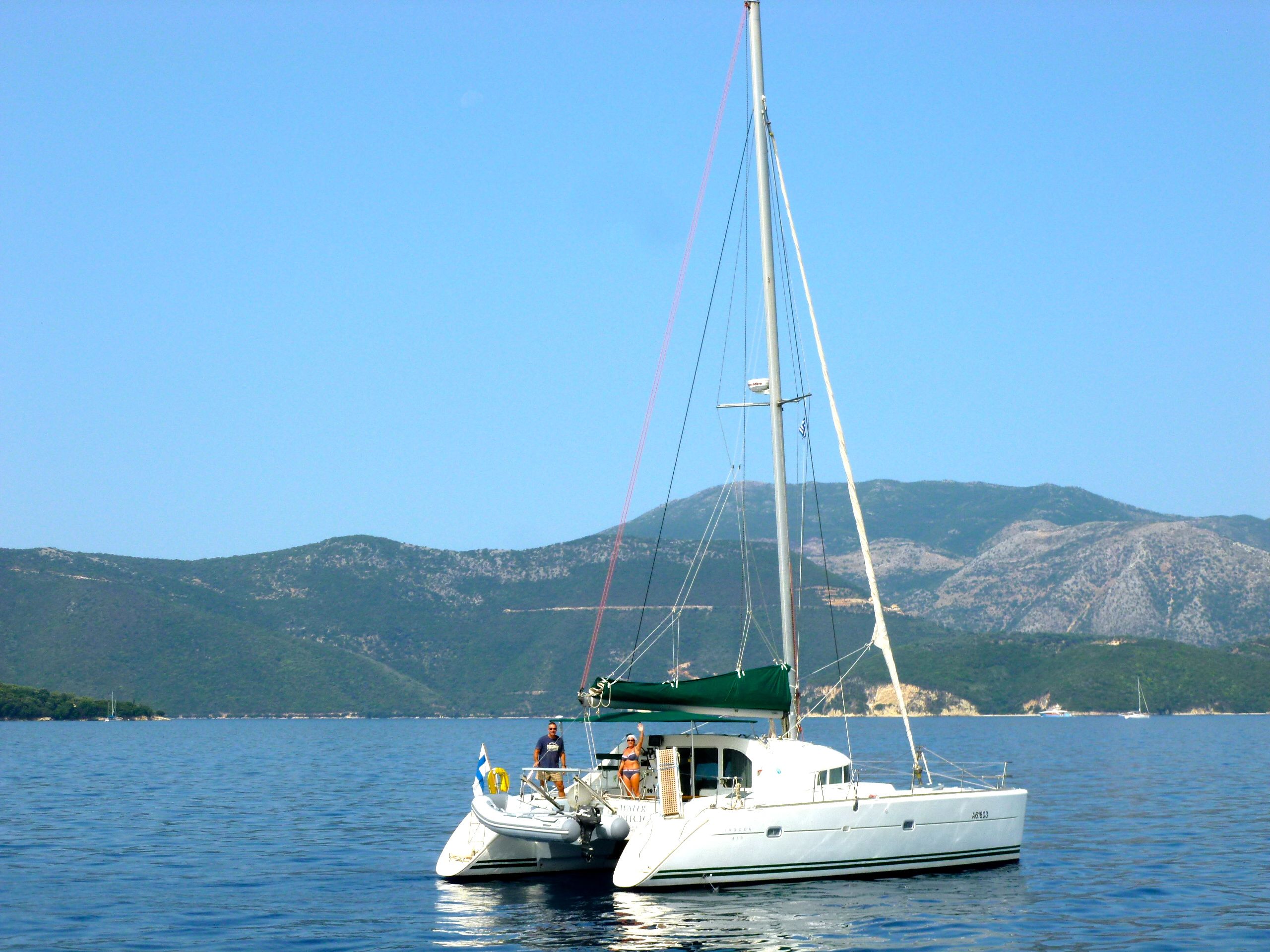 I hamnen i Vathi träffade vi finländska seglarna Helena och Petri med burmakatterna Siiri och Sandy på katamaranen Water Witch. Petri och Helena har under de senaste två åren seglat i den Joniska skärgården och kunde därför ge oss en del goda tips. De finskflaggade båtarna är inte så många på Medelhavet, så det var roligt att möta trevliga finländska seglare på en mycket välskött båt.