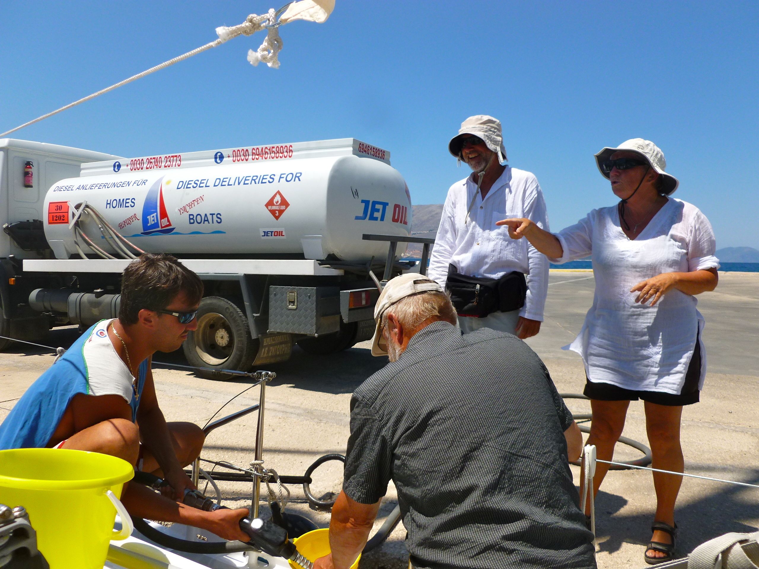 Meningen var att vi skulle träffa Ing-Marie och Håkan på Alacrity på Ithaka redan några dagar tidigare. Men de hårda vindarna och Ninas stukade fot kom i vägen. Men nu var det dags. Vi vände stäven söderut och gick till Sami på Kefallonia, där Alacrity låg sedan två dagar tillbaka. Under färden på fem timmar hann watermakern fylla vår ena vattentank, medan vi hann städa båten och få den ship shape. Dessutom hann vi uppleva ingen vind samt vind från tre olika rktningar, men så är det ju på Medelhavet. Då vi förtöjde i Sami stod en tankbil på kajen redo att ge oss påfyllning i våra dieseltankar. Ja tack, sade vi, och medan vi tankade uppenbarade sig två beduiner på kajkanten. Det blev ett kärt återseende. Senast vi såg Ing-Marie och Håkan var på Menorca förra sommaren, då vi ankrade ihop några dygn.
