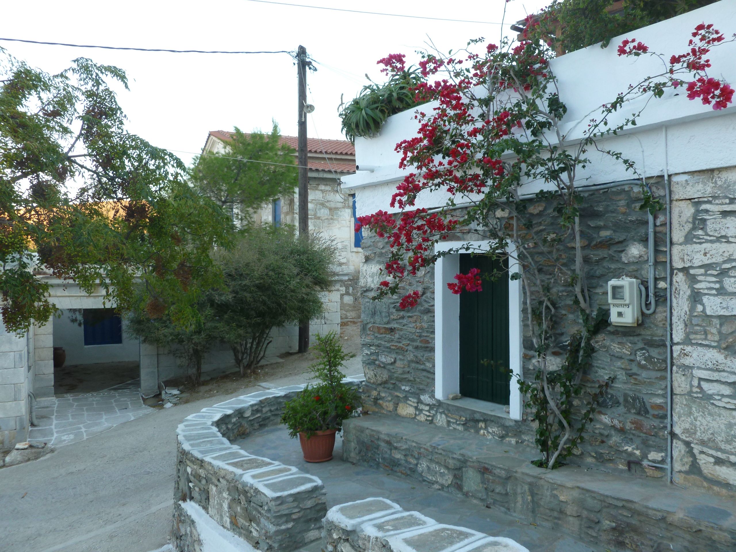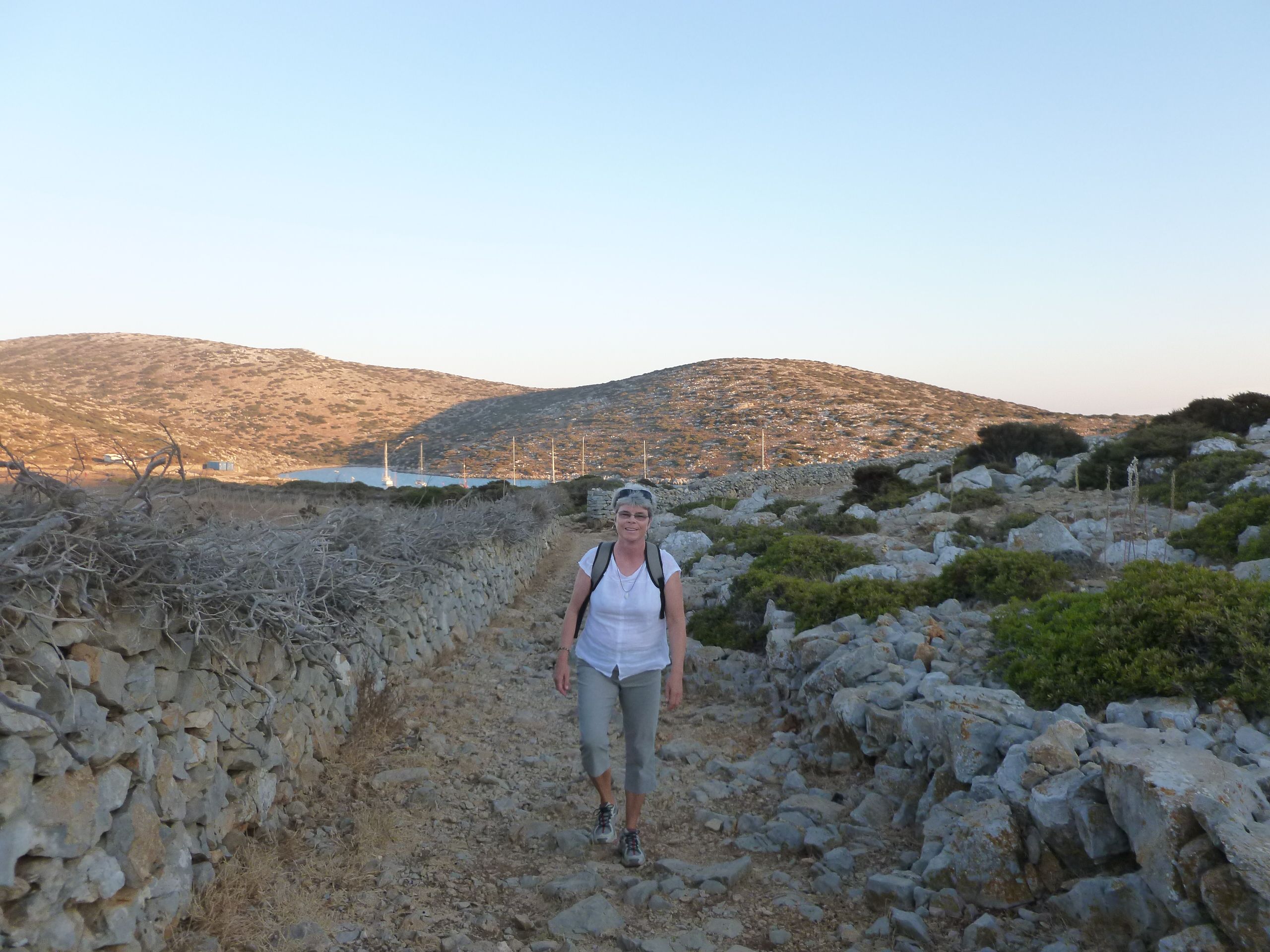 Då vi förtöjt färdigt och pratat litet med besättningarna i de andra båtarna, hann vi med en skön promenad på de omgivande höjderna och i de mysiga gränderna innan solen helt gått ned. En god – och denna gång inte för väl tilltagen – middag på en taverna i hamnen avslutade vår första dag i Kykladerna.