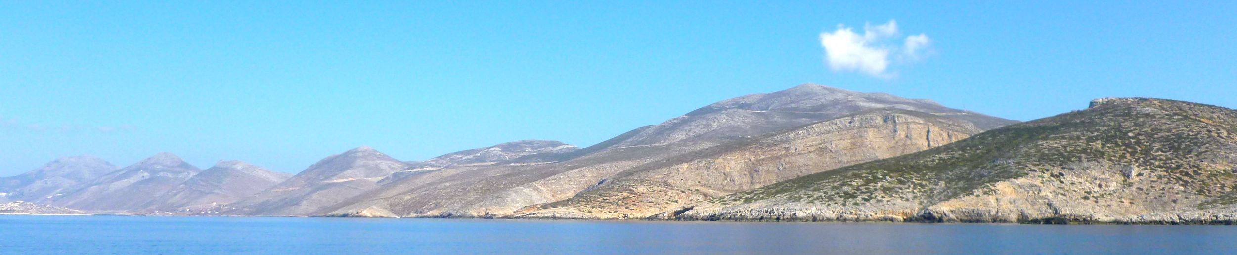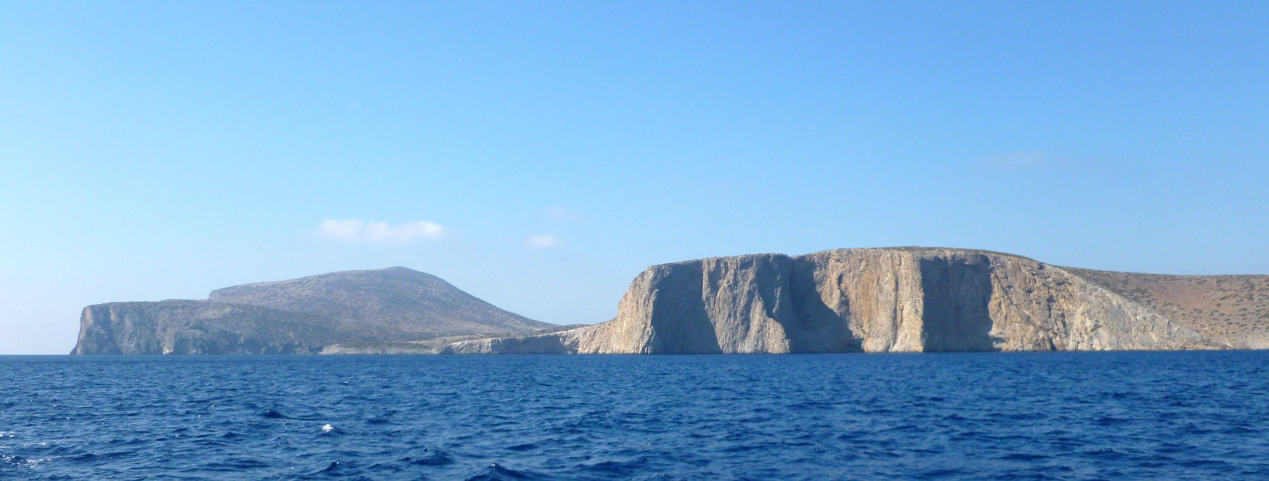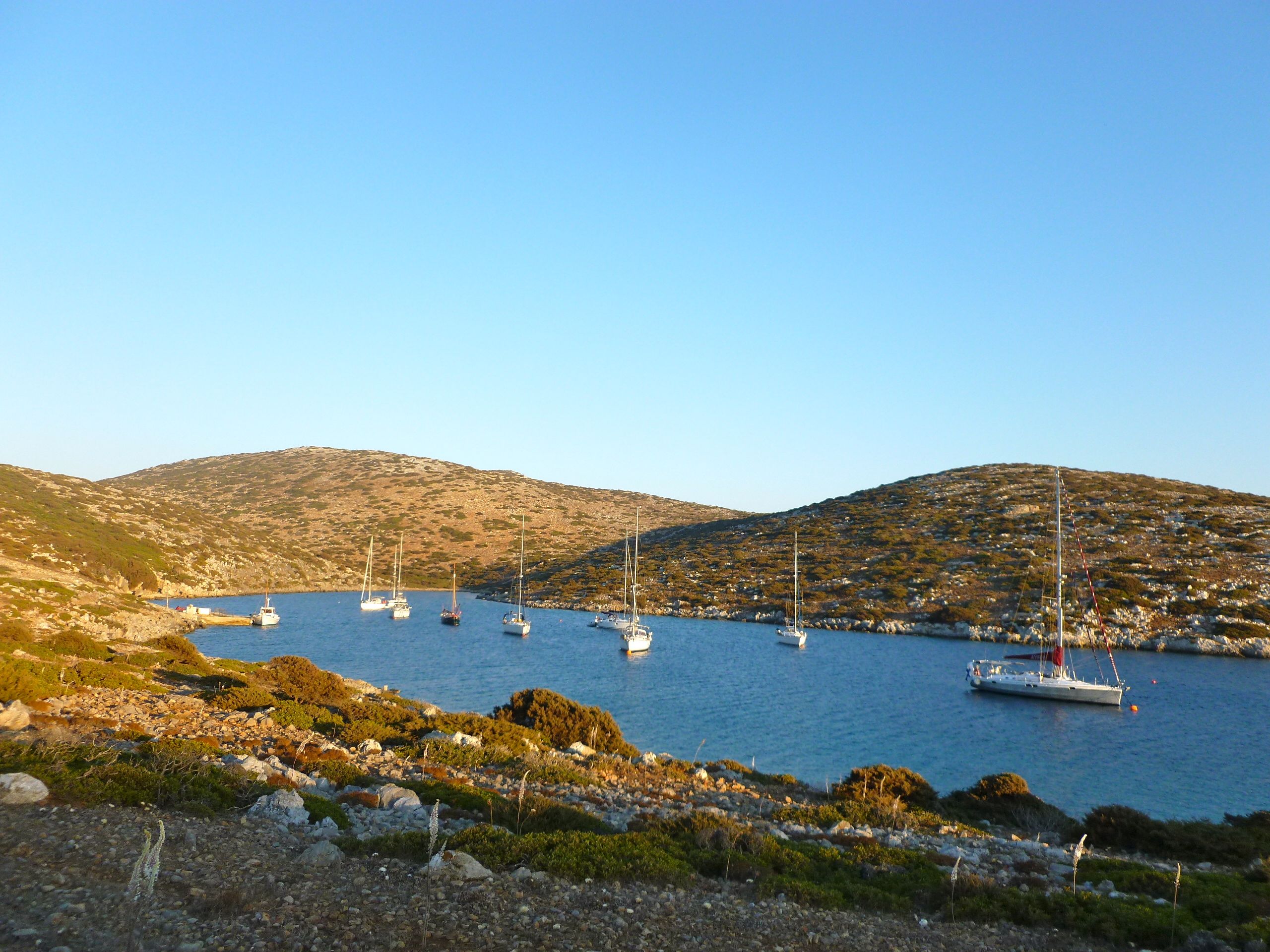 Då vi kom till Amorgos gick vi först in till huvudorten Katapóla, belägen i botten på en djup vik öppen mot väst. I hamnen blåste en frisk nordvästlig vind, som hade gjort förtöjning vid stadskajen besvärlig, i synnerhet som folk hade förtöjt sina jollar i de lediga gluggar som fanns mellan båtarna. Eftersom vi var inställda på att svajankra i en ankarvik litet längre norrut, gick vi glatt vidare från Katapóla. Vid infarten till ankarviken Ormos Kalotiri mellan Amorgos och Nisis Nikouria mötte oss en anblick som förde bergformationen Seven Sisters öster om Brighton i tankarna. De grekiska systarna är dock litet mjukare i formerna än de brittiska.