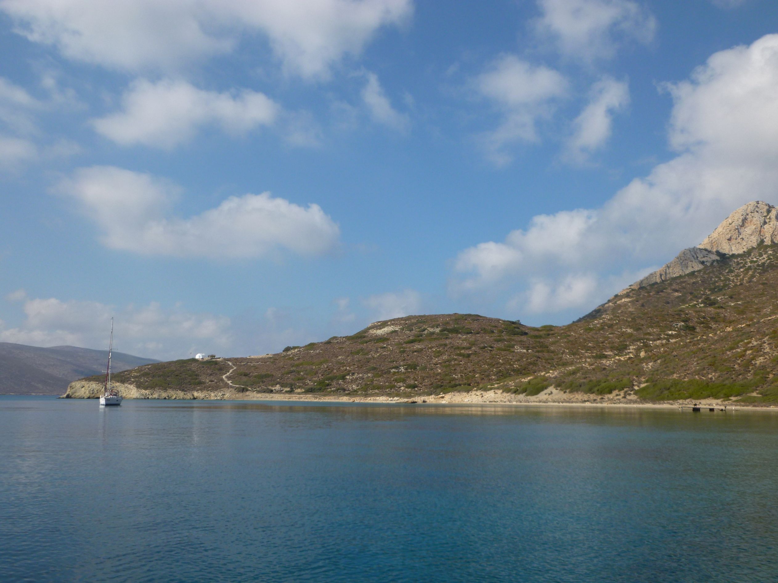 Då vi hissade segel vid hamnutloppet från Levitha, stod det klart för oss att vi gärna vill återvända till öarna i Kykladerna med mera tid och helst utanför meltemisäsongen, det vill säga under tiden april till mitten av juni. Under vår snabba genomsegling av Egeiska havet hann vi nu endast få några fina smakprov av det Kykladerna har att erbjuda. Men nu är vi ju på väg till Turkiet, och vill gärna hinna segla ett par veckor där innan det blir dags att ta vinterhamn i Finike under andra hälften av oktober.