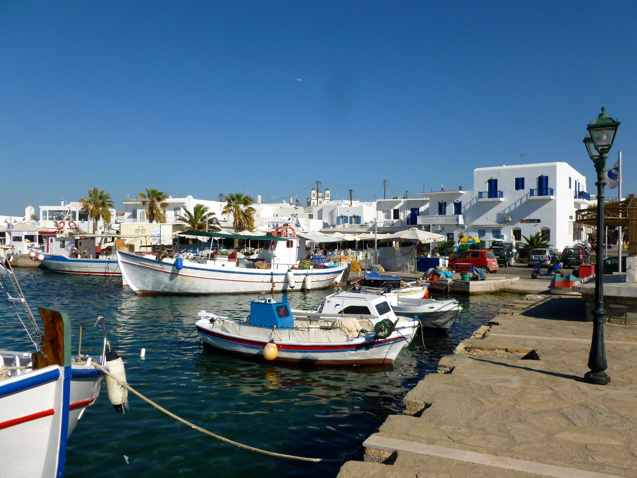 Följande dag begav vi oss återigen iväg i soluppgången och fick motorisera i stiltje. Först under de sista milen av vår 45 sjömil långa färd till Paros vaknade vinden till liv och tilltog – som den ofta gör just då man ska in i hamn. Det var gott om plats inne i hamnen i Naousa, som ligger i en stor vik på nordsidan av Paros, och vi kunde i lugn och ro plocka upp vår mooringline invid en 54-fotare med besättning från Australien. Då vi förtöjt färdigt kom det in den ena båten efter den andra. Även om högsäsongen är slut för länge sedan lönar det sig att komma i god tid till hamnarna.